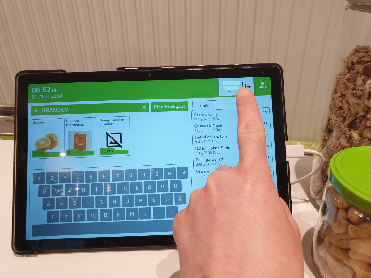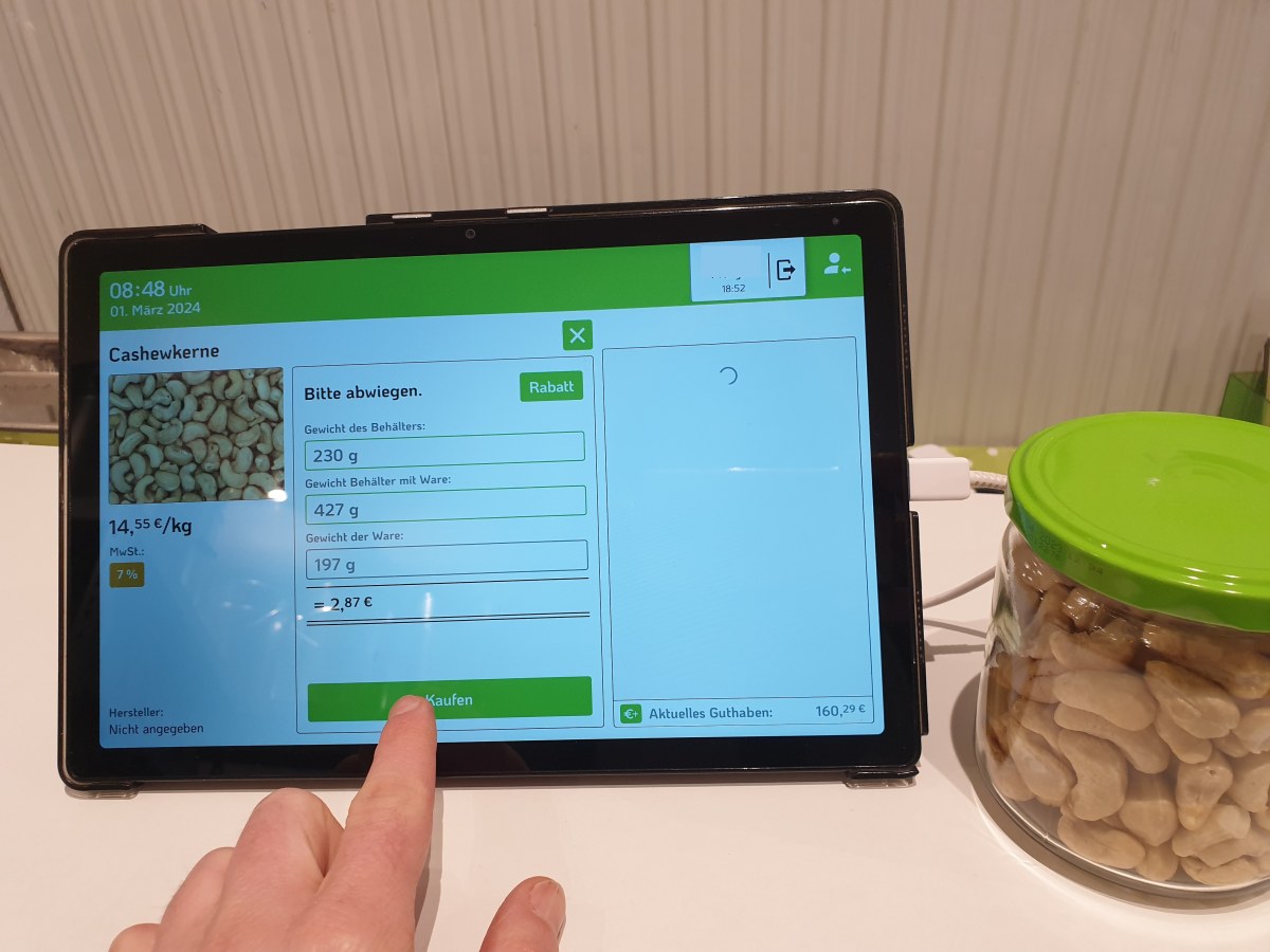 Für deinen Einkauf loggst du dich auf einem der bereitstehenden Tablets ein. Wichtig ist, dass du die Behälter einmal vor dem Befüllen wiegst und dann danach erneut. Dann wählst du aus, welches Produkt du einkaufen möchtest und notierst das jeweilige Gewicht auf unseren Tablets. Die Einkaufsmenge wird dann automatisch berechnet. Und der Einkaufwert wird bargeldlos von deinem Guthaben abgezogen.